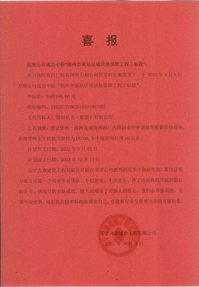 祝賀公司成功中標(biāo)“錦州市南站區(qū)域供熱保障工程三標(biāo)段”